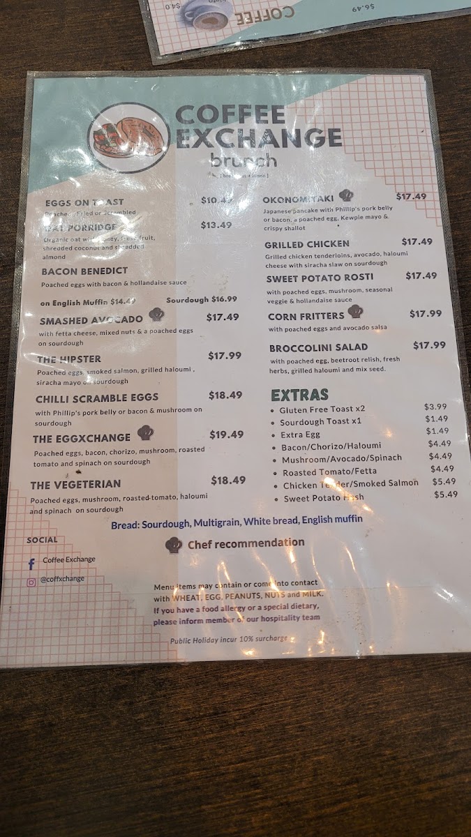 Coffee Exchange, located at 9-11/1 Little Collins St in Melbourne, is a cozy café that delights coffee lovers and breakfast enthusiasts alike. With a focus on quality ingredients, their menu features standout items such as the savory EggXchange with spicy sausages and the delectable chicken avocado bagel. Customers rave about their freshly baked croissants and unique offerings like sweet potato rosti, paired perfectly with rich coffee and matcha lattes. The inviting atmosphere, coupled with attentive service and an emphasis on sustainability—evidenced by their use of paper packaging—makes Coffee Exchange a must-visit destination for a satisfying breakfast experience.